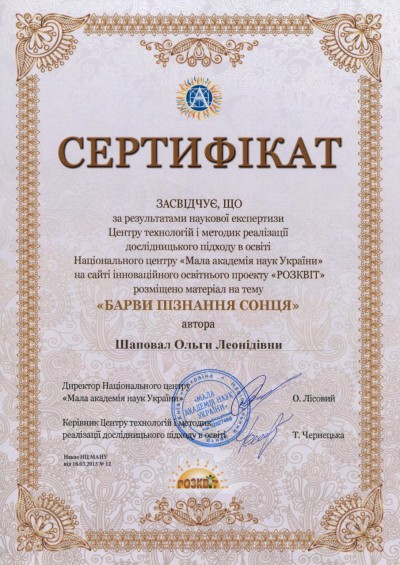 Маю сертифікат, який засвідчує, що за результатами наукової експертизи Центру технологій і методик реалізації дослідницького підходу в освіті Національного центру «Мала академія наук України» на сайті інноваційного освітнього проекту «Розквіт» розміщено матеріал на тему «Барви пізнання сонця» .